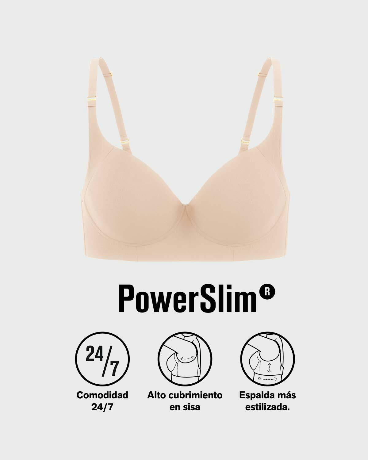 - Capa interna de nuestro material de compresión PowerSlim® en la base de las copas y la sisa, para disimular los rollitos.